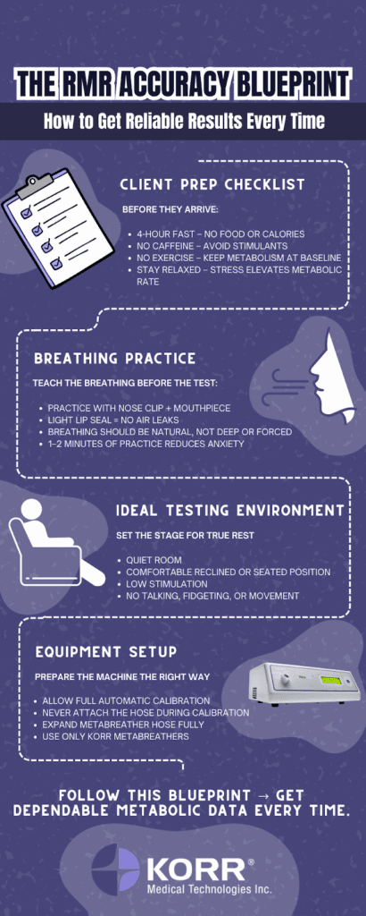 Getting accurate RMR results isn’t just about turning on the machine and having your client breathe into a tube. The difference between meaningful data and misleading numbers often comes down to proper preparation, correct positioning, and knowing how to spot when something’s off. Let’s explore how to ensure every RMR test you conduct delivers the reliable insights your clients deserve.