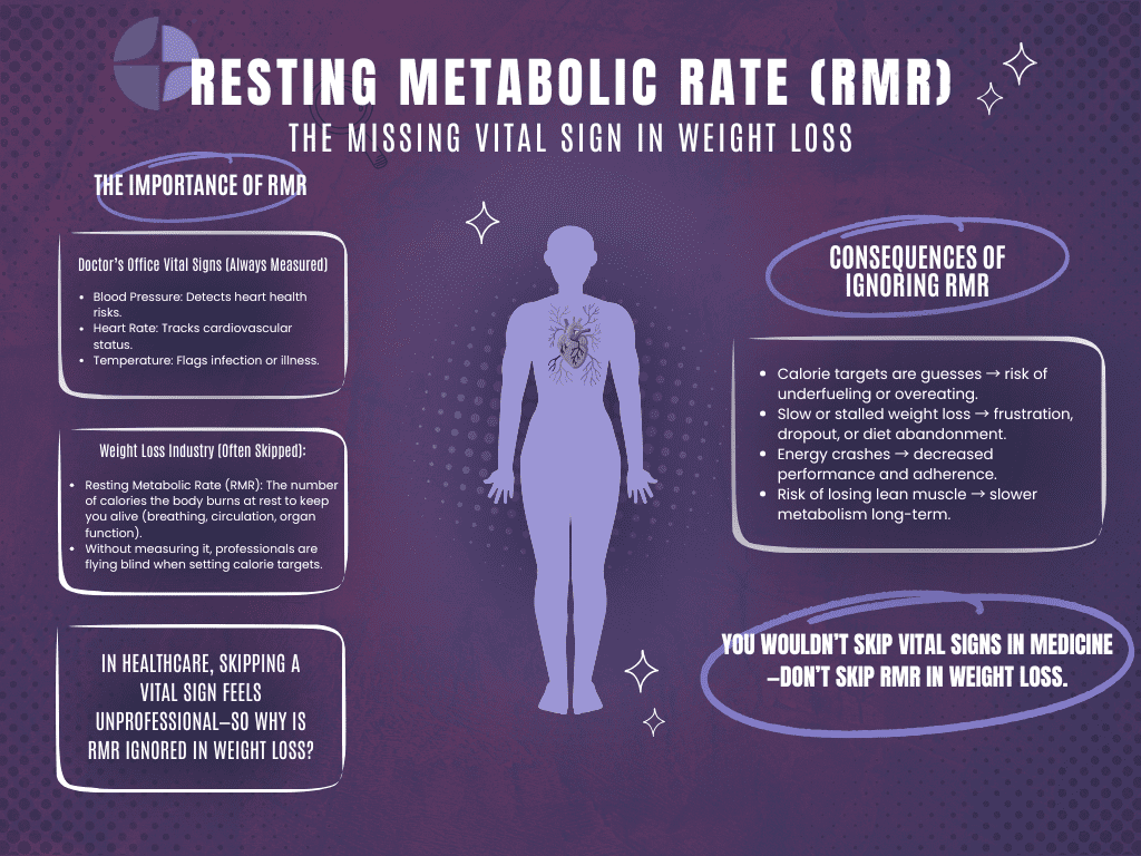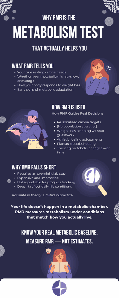 RMR testing provides the metabolic information you need for practical decision-making. Whether you’re designing a weight loss program, adjusting nutrition for athletic performance, or managing weight after significant loss, RMR gives you actionable data.